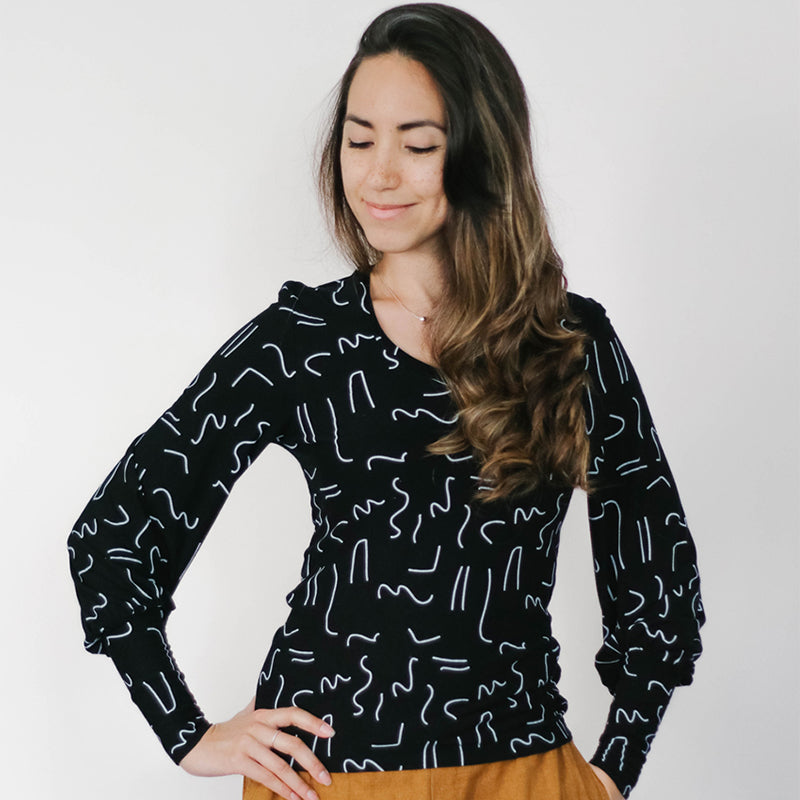 Vera is a top pattern designed for knit fabrics that has a fun, full sleeve. You can grab the pattern here right now, or read on for more details.